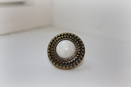 Den er gullfarget med ornament, og i midten har den en kremhvit sten-imitasjon.