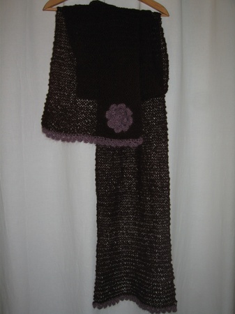 Langt, mykt og luftig strikket skjerf i 100% børstet alpakka (Kid-Silk og alpakka i kant og blomst).