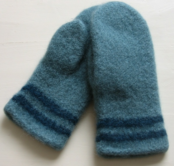 Tykke tovede ullvotter. Strikket i mellomgrønn med mørke grønne striper.