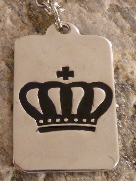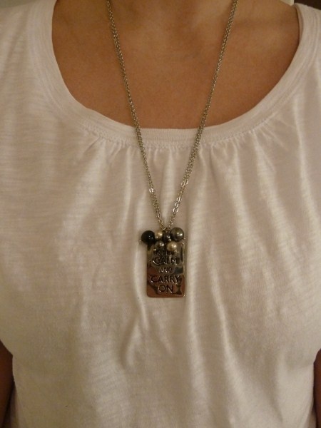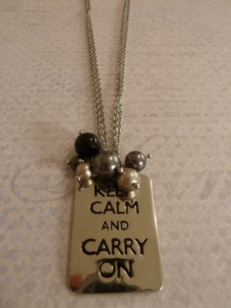 Flott sølvfarget anheng med teksten " keep calm and carry on " på den ene siden og en krone på den andre siden.Flotte swarovskiperler i mørk grått , svart og platinum. Sølvfarget,dobbel lenke og forlengelses- lenke.