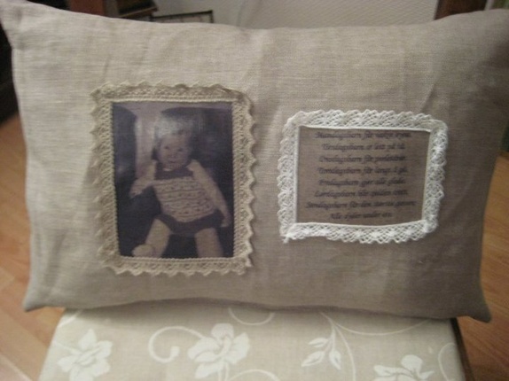 Jeg syr puter av lin, med valgfritt bilde. Her har jeg bilde av barna mine på.