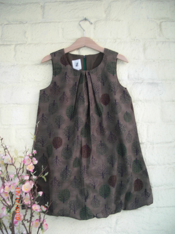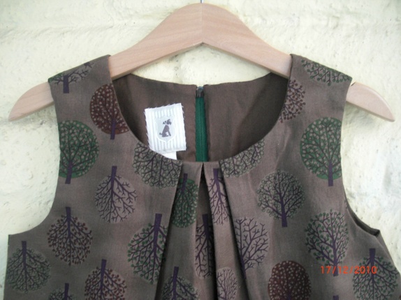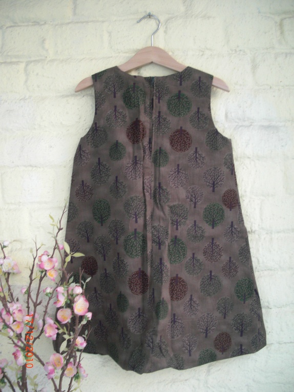 Helforet brun og stilig kjole med tremønster. Legg øverst midt foran og glidelåslukning bak.