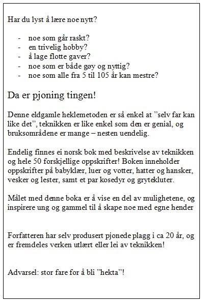 ”Pjoning i mitt hjerte” er den første norske boka som er fullstendig viet til den enkle hekleteknikken pjoning.