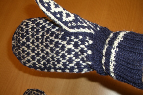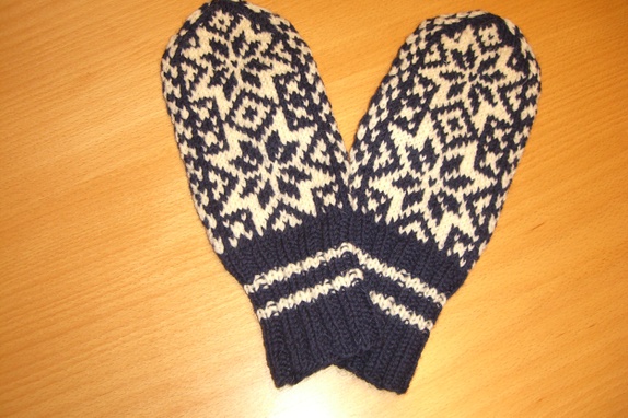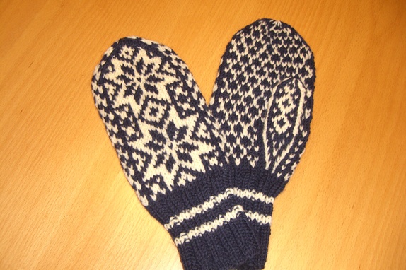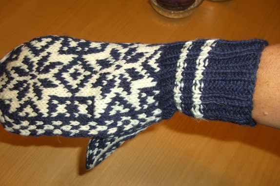 Håndstrikket Selbuvotter i marineblåt og hvit i 100% ull. Garnet er slitesterkt og holder formen lenge. Gode og varme i vinterværet!
