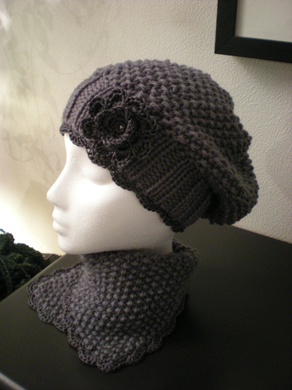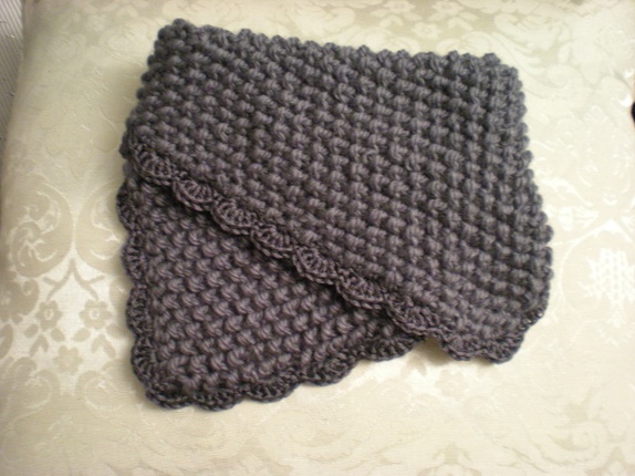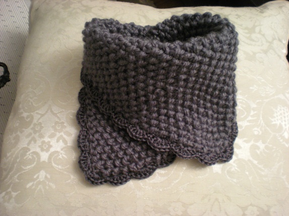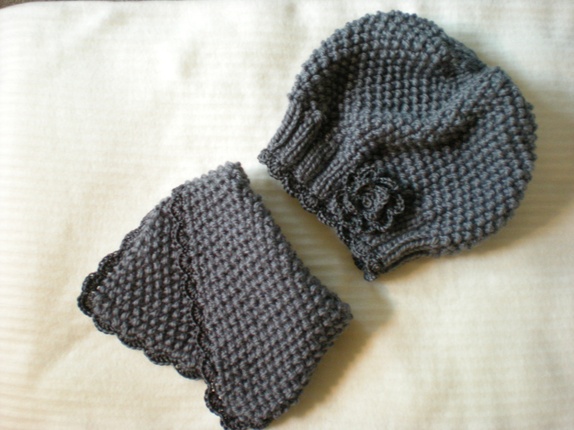 Luen er strikket i perlestrikk i Gullgarn, 50% superwash ull og 50% acryl. Kanten er heklet i merisert garn (blankt garn) i omtrent samme farge, stålgrått. Blomst er laget som brosje med nål bak. Maskinvask.
