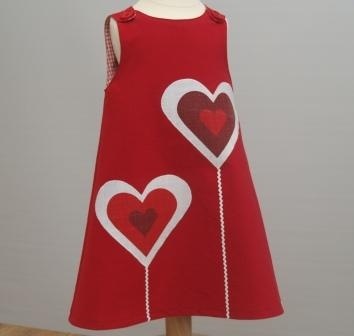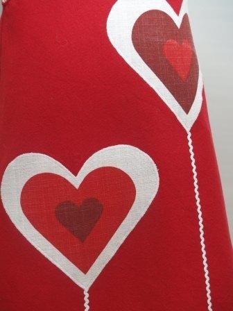 Hengslekjole, sydd av en ensfarget, rød gardin i litt grovt, men mykt bomullsstoff. På forsiden er kjolen pyntet med to store hjerter som står på hvite stilker av kroklisser. Hjertene er i grovere stoff enn kjolen, også disse klippet fra en duk. Røde knapper i selene. Kjolens overdel er foret med et smårutete bomullsstoff i rødt og hvitt.