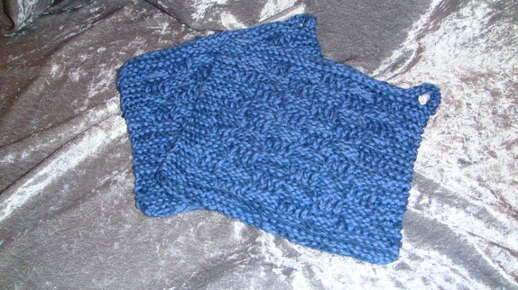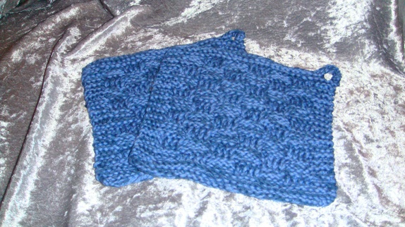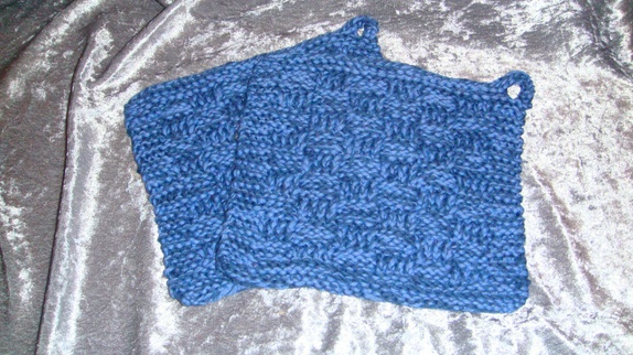 Gryteklutene er strikket i to blå farge med dobbelt 100% bomullsgarn.De kan vaskes på 60 grader. størrelse 18 * 18 cm. Før 70,-