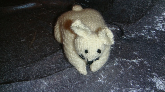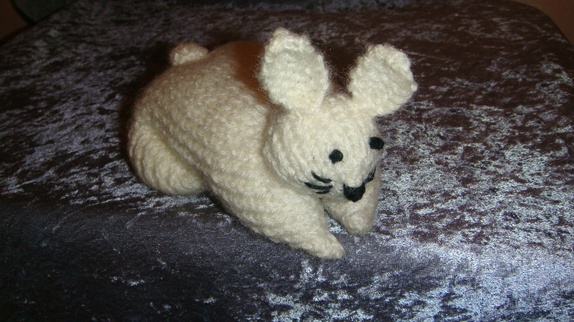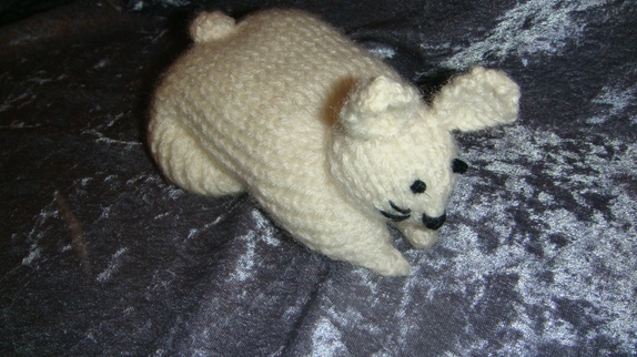 Den hvite kaninen er 15 cm lang og høyden er 7,5 cm.Øyne og snute er brodert på. Før 75,-