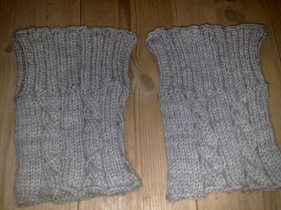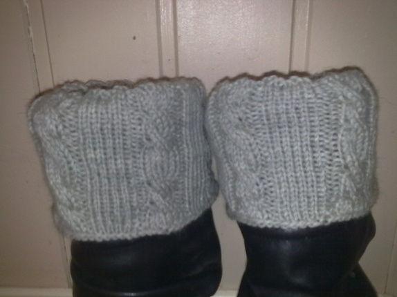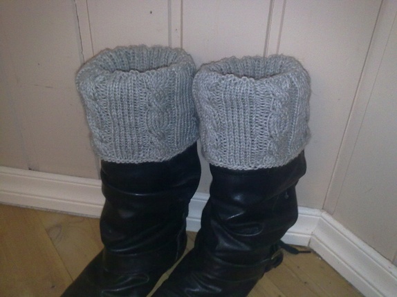 Strikket støvlettpynt i lysgrå med flettemønster.One size. Strikket i superwashgarn.