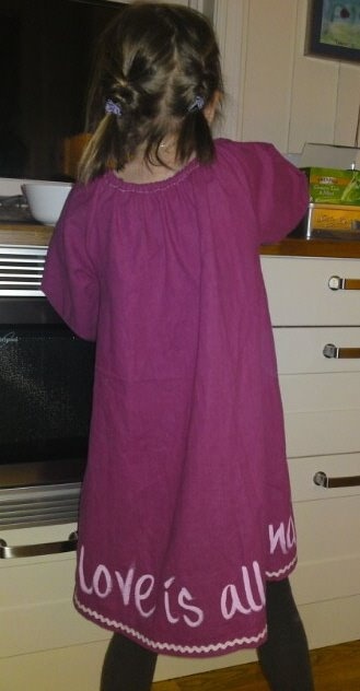 Kjole i cerise lin. Str ca 5 år. Med strikk på armer og hals, er denne modellen fin å vokse både inn i - og ut av.