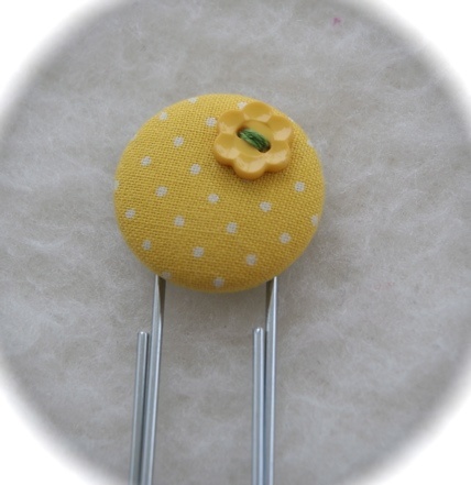 Bokmerke laget av stor knapp trukket med stoff og påsydd knapp.