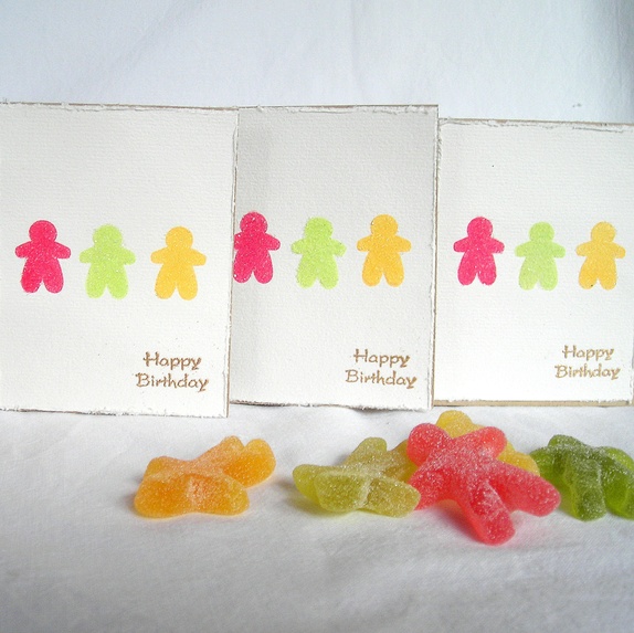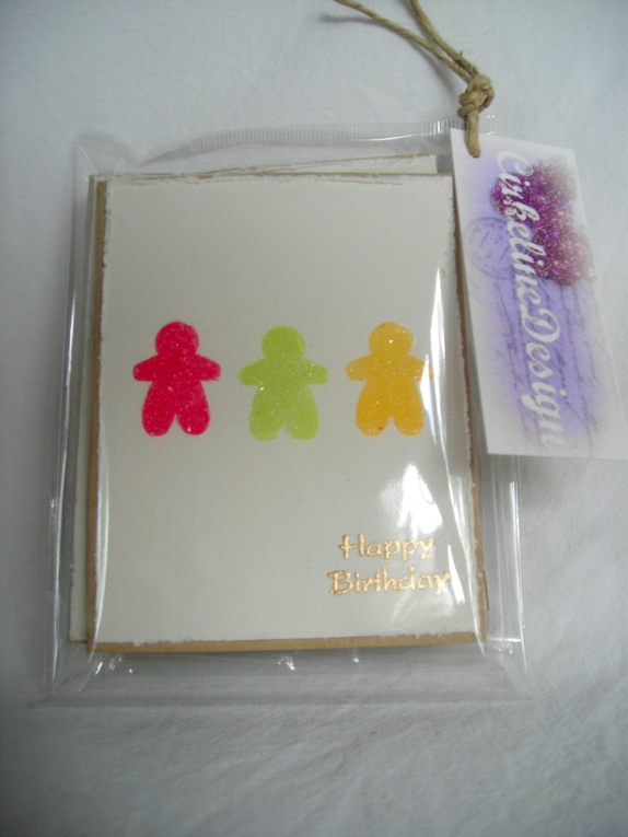 Kortene er dekorert med akvarellpapir med slitte kanter. Seigmennene er håndstemplet og påført et spesielt glitter som er til forveksling likt sukkerstrø. "Happy birthday" er embosset (forhøyet stempling) i gull.