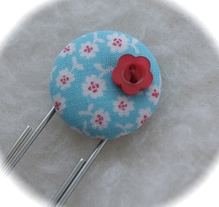 Bokmerke laget av stor knapp trukket med stoff og påsydd pynteknapp.