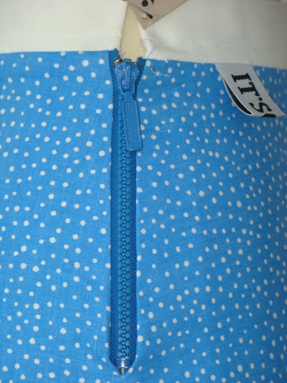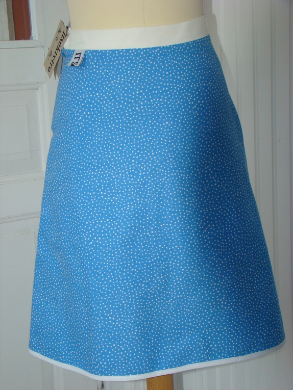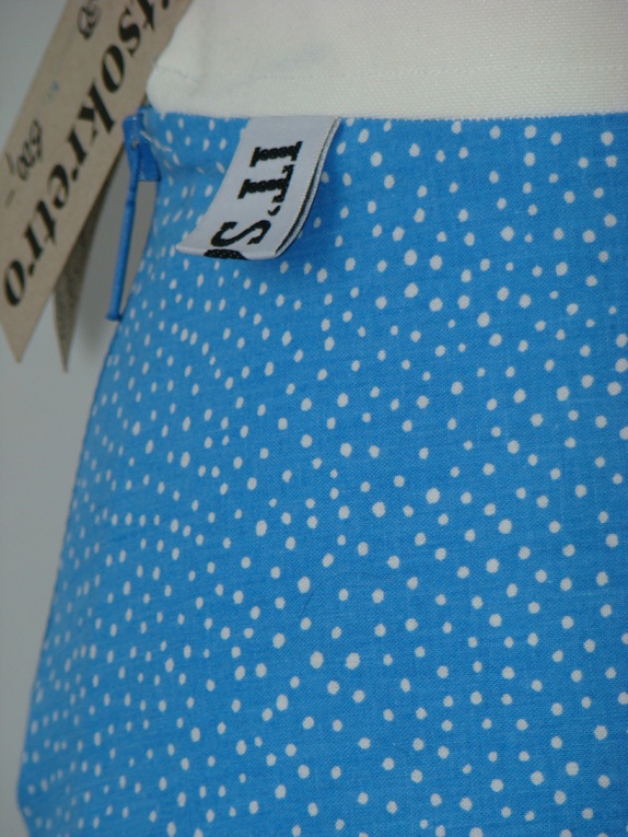 Skjørt sydd i blått vintage bomullsstoff med hvite prikker. Kraftig vintage glidelås i siden (ubrukt). Hvitt polyesterbånd i livet. Skjørtet er ca størrelse M. Eksakte mål: Midje: 71 cm Hofte: 85 cm