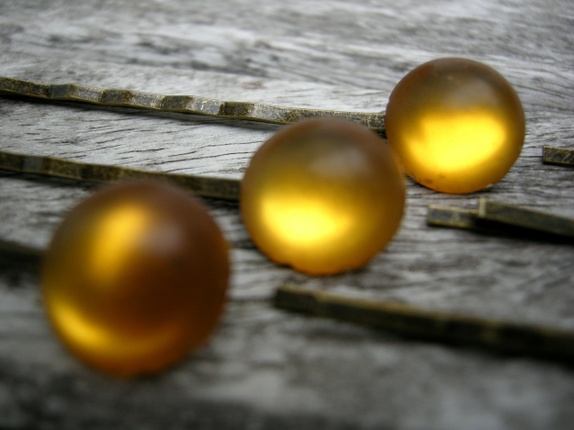 6 nydelige hårspenner med matt gule cabochoner av glass. Baksiden av glass bladet er smurt med "sølv" så bladet får en skinnende glød på samme måte som gjenstander laget med fattigmanns sølv.
