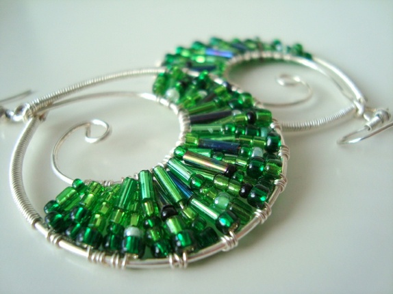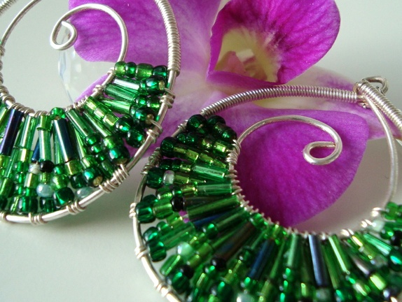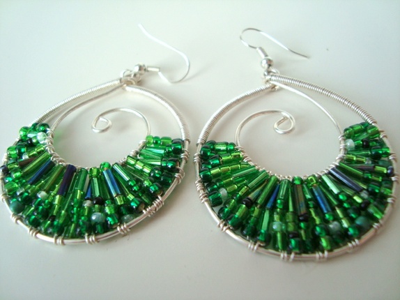 Earrings are made from high quality silver plated copper wire and laced with glass beads in various shades of green.