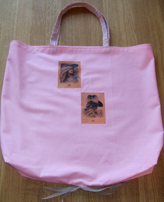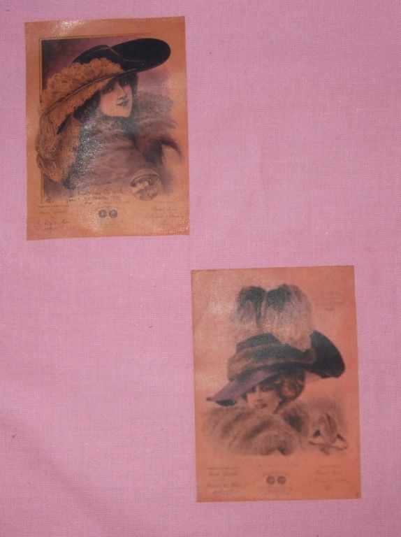 To gamle bilder av damer med flotte hatter er overført til den ene siden av vesken.