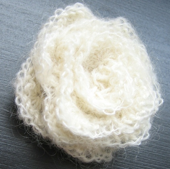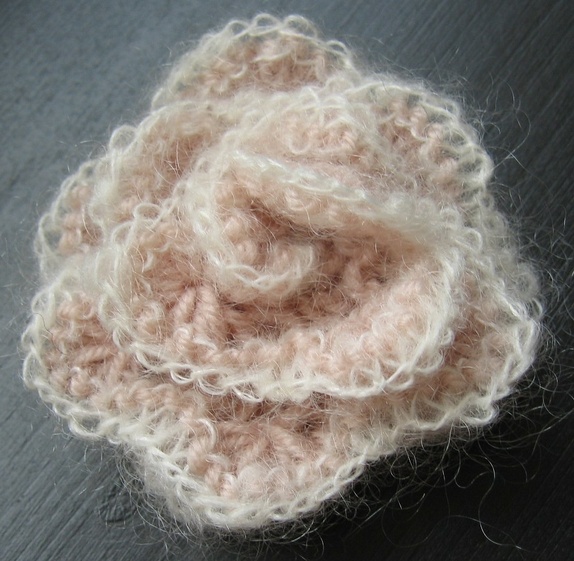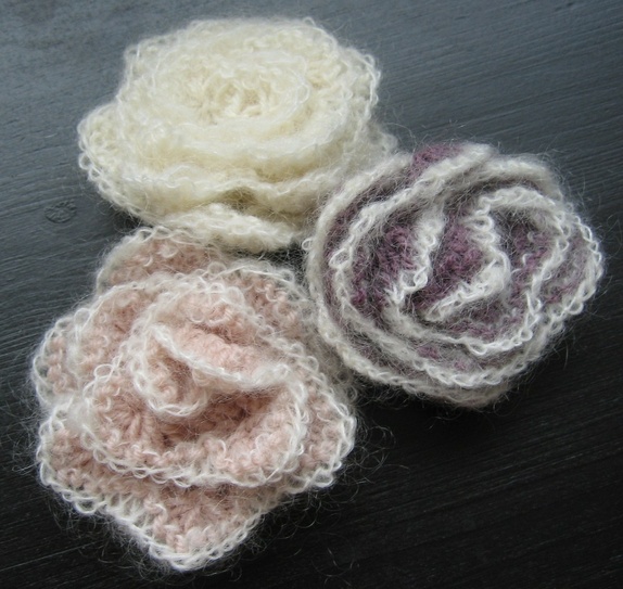 Sett med 3 strikkede roser. Hvit, rosa og lys lilla. Ull/alpakka/mohair.