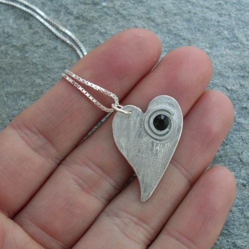 Smykke i 925 sølv. Det mattslipte hjertet er saget ut for hånd og dekorert med en nydelig glitrende 4 mm stor swarovskikrystall i fargen JET (sort). Anhenget måler ca 2 x 2 cm.