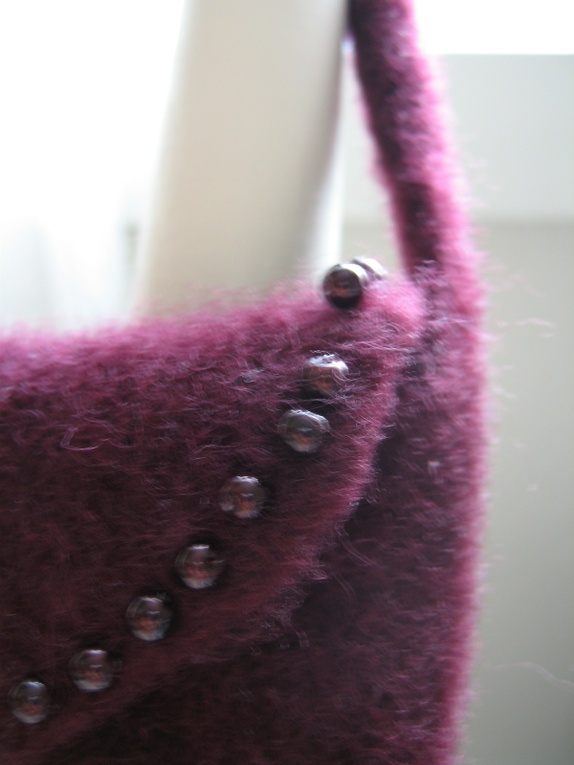 Tovet veske med blomst og perler. Mørk varmlilla. Trykknapp i lokket.