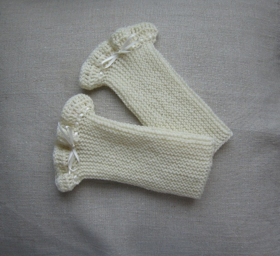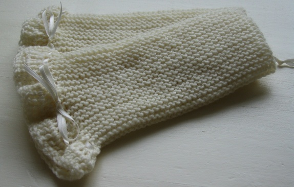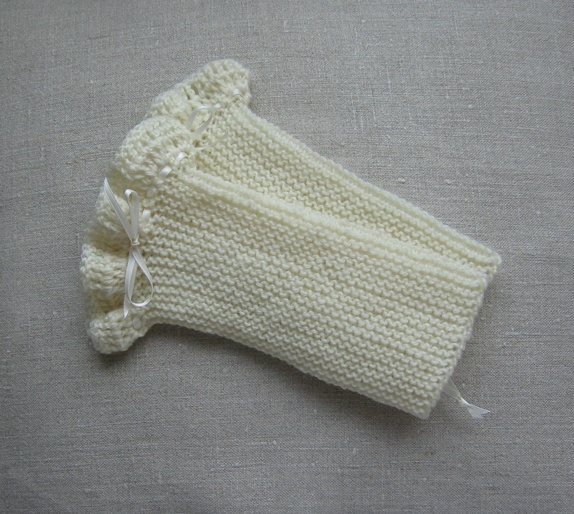 Pulsvarmere i rillestrikk, med heklekant. Kremhvit. Babyull: Maskinvask 40C.
