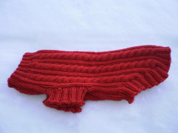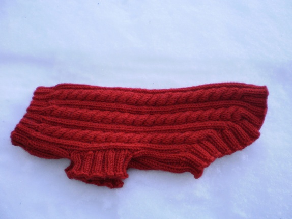 Rød hundegenser med flettemønsterLengde: 31 Omkrets: 26100% UllHåndvask. Strekkes i fuktig tilstand.