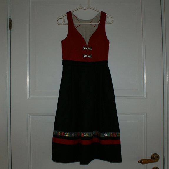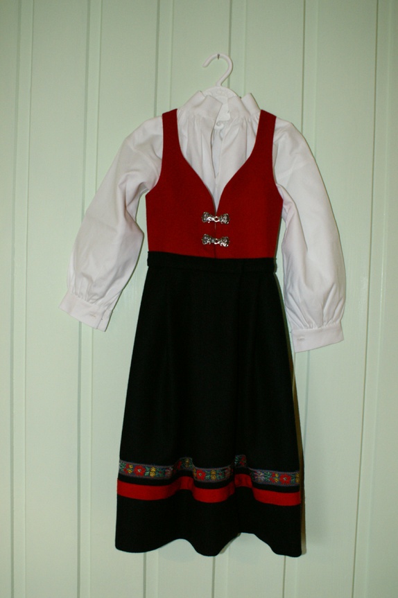 Bunaden er sydd i 100% ull klede som brukes til bunader, svart skjørt og rødt liv og med pyntebånd nederst. Livet er foret med baskerlin. Det er ekstra sømrom, så det går an å sy ut og bruke bunaden i flere sesonger.