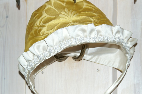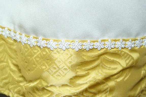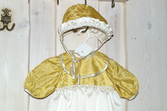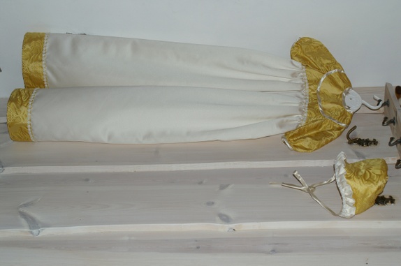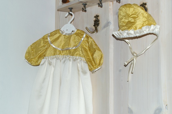 Dåpskjolen er sydd i brudesateng og ekte silkebrokade. Det følger med lue. Smekka foran er løs.