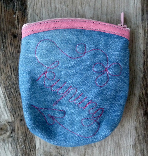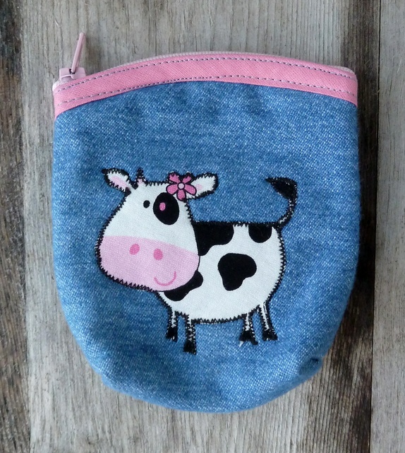 Dongeri m/ applikert kumotiv og frihandsbrodering/tekst ("kupung") på baksida.