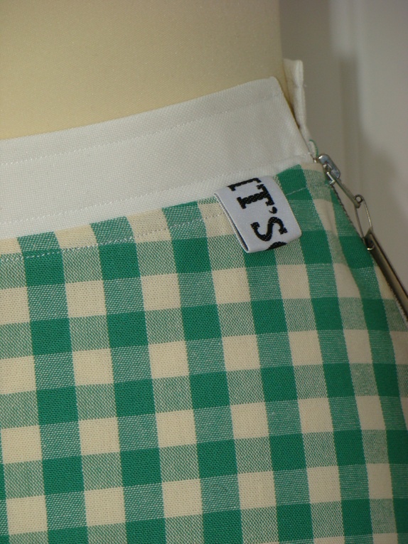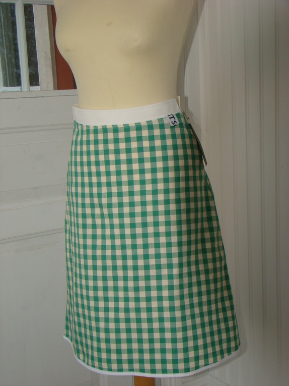 itsokretro skjørt. Sydd i vintagstoff i grønn og hvitrutet bomull. Hvitt polyesterstoff i livet. Original vintage glidelås (ubrukt) i siden.Målene på skjørtet er:Midje : 71 cmHofte: 84( Ca. strørrelse M) vintage skjørt