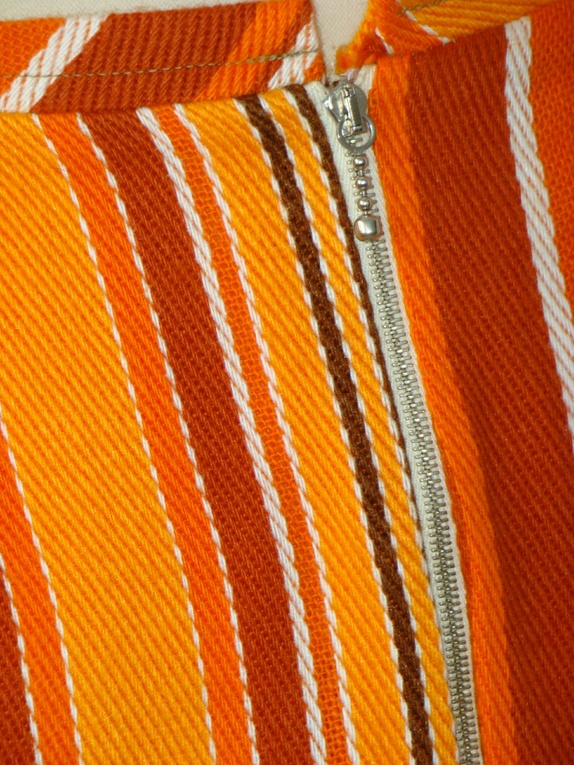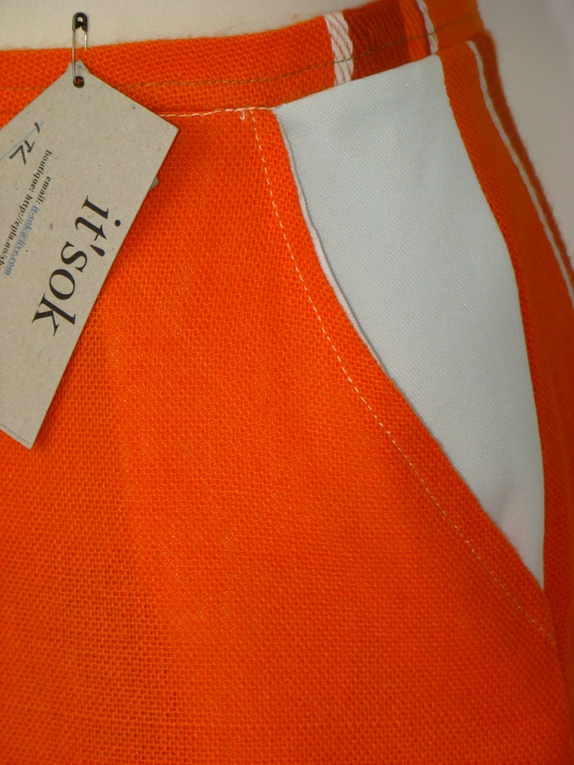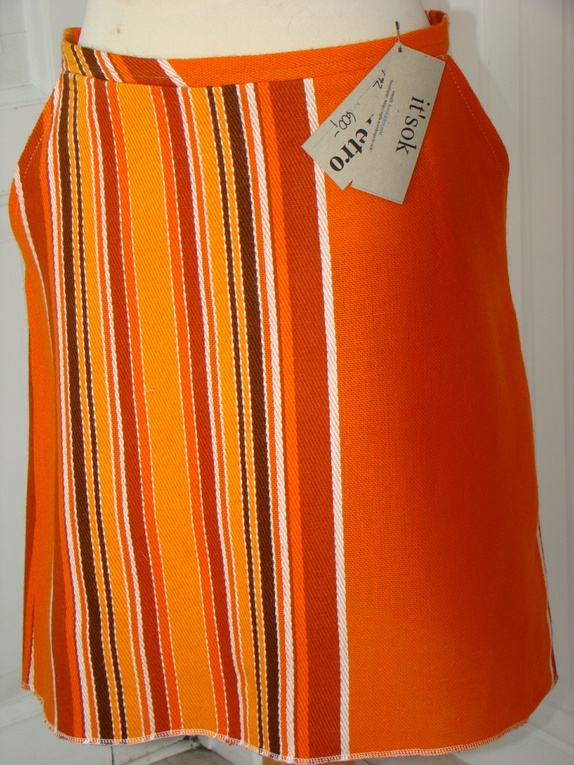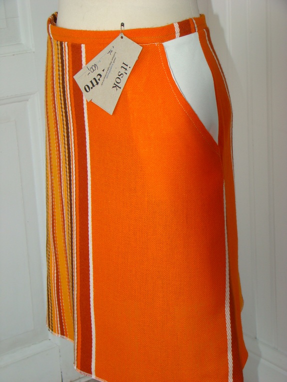 Skjørt sydd i vintage stoff i oransje med striper. Skjørtet har lommer laget i hvit polyester. Usikkert hva stoffet er, men det er en slags ullblanding - ikke ren ull så kanskje ull/polyester? Vintage glidelås (ubrukt) i metall bak. Str er ca L ( 40-42). Passer som høst- og vinterskjørt