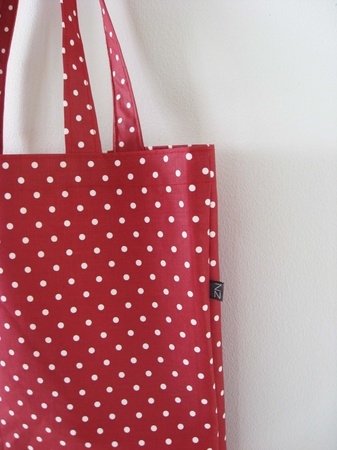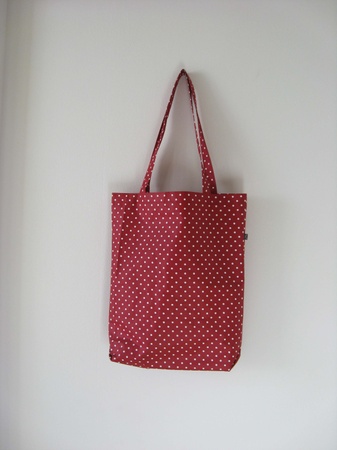 Stort rødt handlenett med små hvite prikker