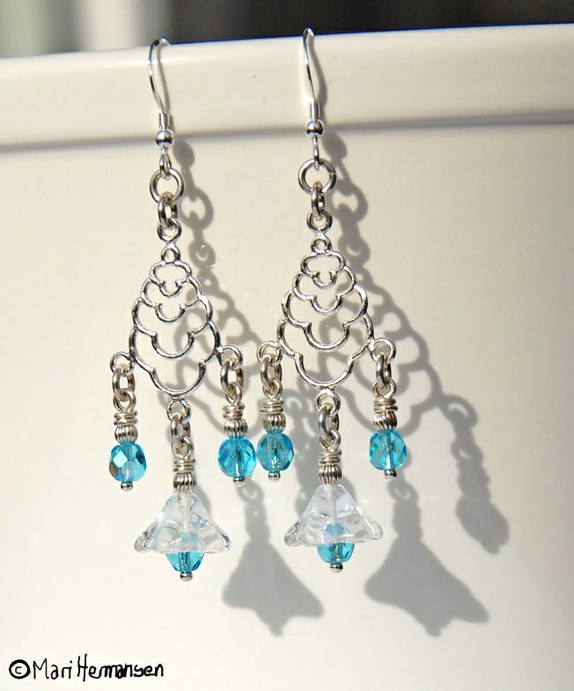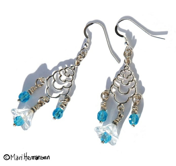 Håndlagde øredobber med glassblomster(12mm store) og fasetterte, lyseblå, tjekkiske glassperler.