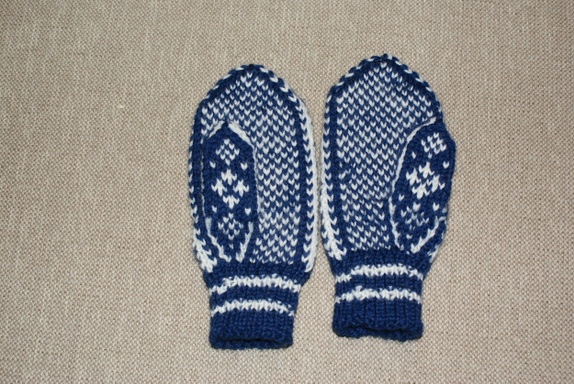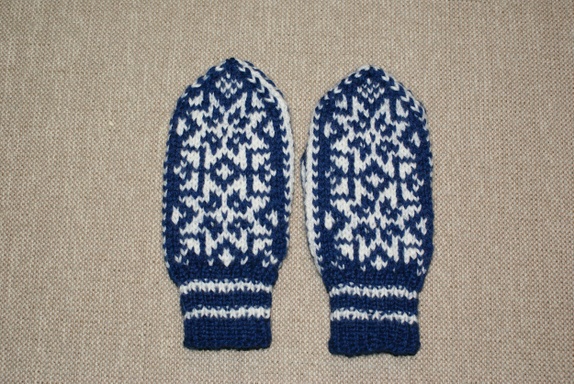 Vottene er håndstrikket i blått og hvitt i 100% ull.