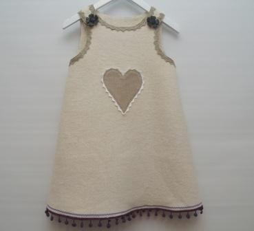 God og varm vinterkjole sydd av et ensfarget, naturhvitt ullteppe. Kjolen er perfekt til å holde små, kjoleglade frøkner varme på kalde vinterdager, utenpå en genser og en strømpebukse eller bukse.