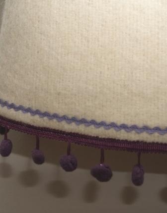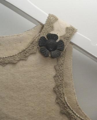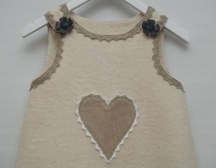 Kjolen er pyntet med en linfarget, vevd bomullsblonde rundt halsen og armhulene. Langs nedre kant er det et lilla pongpongbånd og en smal lilla kroklisse. På brystet er det applikert et hjerte, klippet fra en grovvevd bukse i 100% lin.