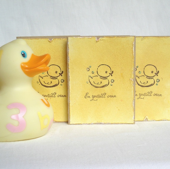 På kortene er det limt håndmalt akvarellpapir med gulfarge og lett gulldryss. Badeanden og teksten "En spesiell venn" er håndstemplet i sjokoladebrunt, og boblene rundt badeanden er markert med glitterlim.