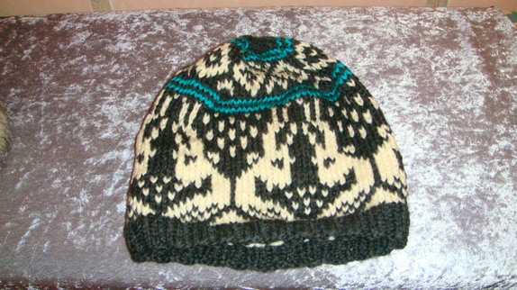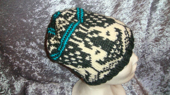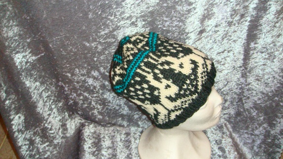 Luen er håndstrikket i mørk grå,hvit og turkis 100% ren ny ull. Størrelse :Dame/liten herre. Kan vaskes på 30 grader ullprogram i maskinen.Uten skyllemiddel.