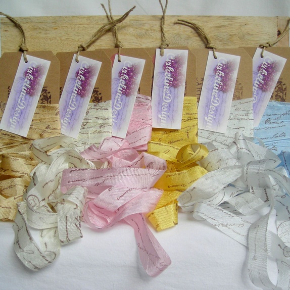 Båndet er håndstemplet i mørk brunt med et manuskriptstempel, som gir et fransk shabby chic-preg. Det er kjempefint, til dekorasjoner, oppheng, kortlaging, scrapbooking etc etc.