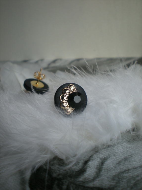 Disse øredobbene består av sorte knapper, gull-detaljer og store, sorte swarovski-stener.