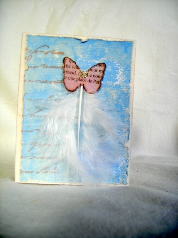 På kortene er det limt håndmalt akvarellpapir i lys blått med håndstemplet tekst og slitte kanter. Motivet er en grålilla sommerfugl med sølv glassglitter og hvit fjær.