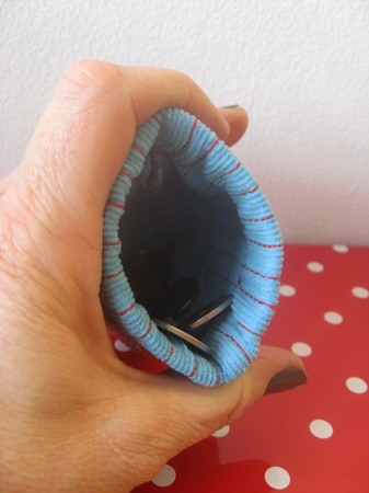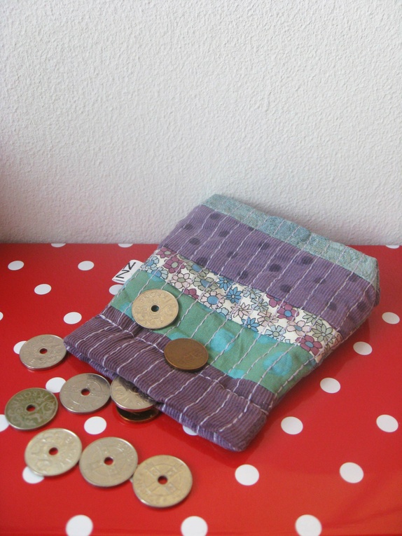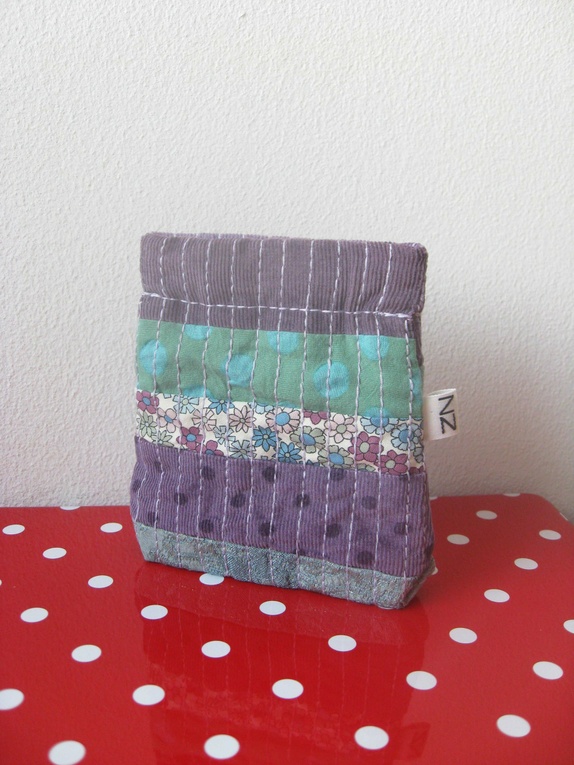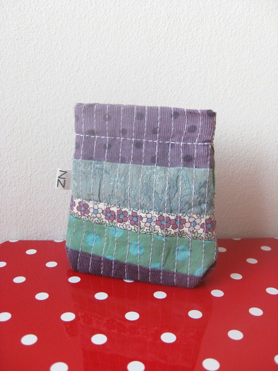 Pungen er sydd av mønstrete bomullsmaterialer med et lite innslag av silke. Pungen har "klemmelukning" og er foret med lilla lin. Det er sydd tette vertikale stikninger i lys lilla over det hele.