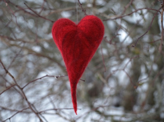 tovet rødt hjerte med fisketråd til oppheng. Eller klipp av tråden og legg den på hodeputen til din elskede!Mål ca 9 x 17 cm