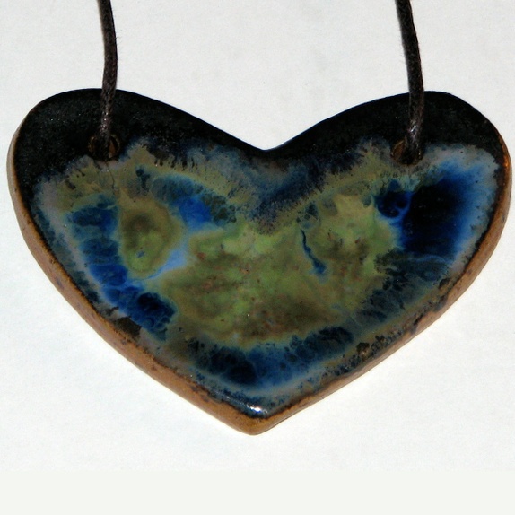 Stort hjertesmykke i grønt og blått, med skinnsnor. Ingen glasur under. 7 cm. på det bredeste