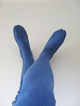 Lange, deilige knestrømper som rekker godt over knærne. De er sydd i lilla og mellomblå, smalstripete bomullsjersey. Knestrømpene er fasongsydd med en dekorativ overlocksøm på utsiden. De finnes i 2 størrelser: 36-38 og 39-41.