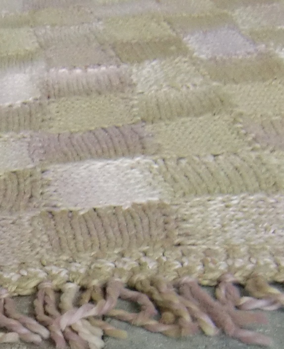 Teppet har heklet kant rundt og frynser på den ene kortsiden.