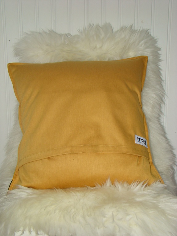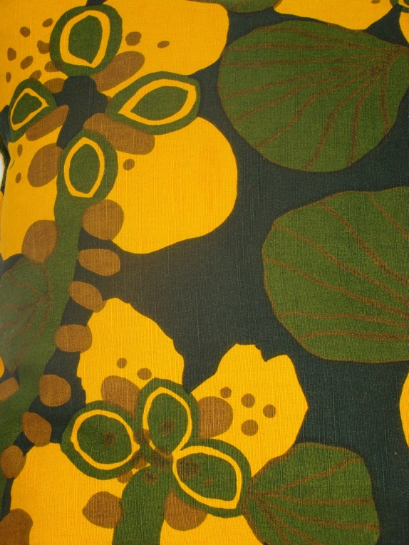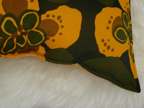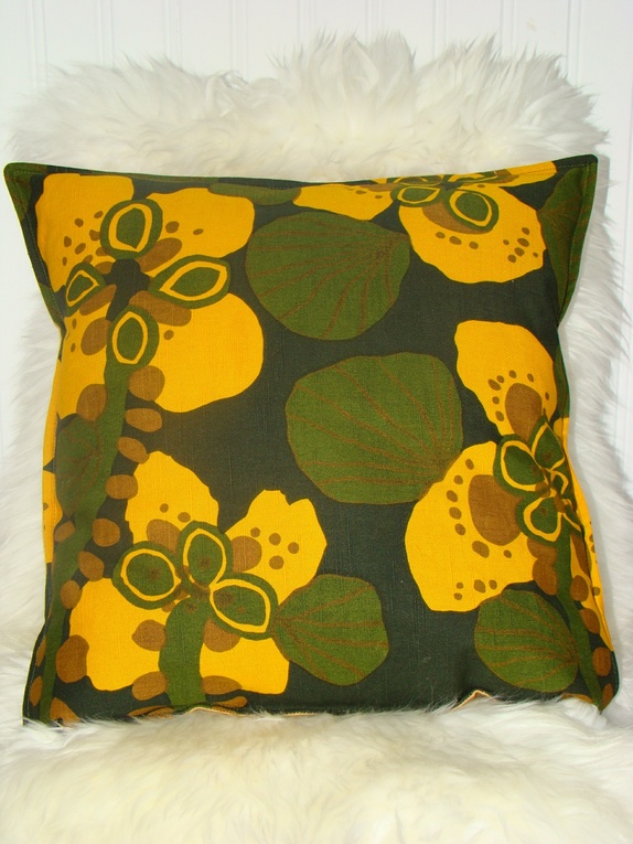 Putetrekk sydd i vintage stoff. Stoffet "Unikko" er fra Borås Tekstiler, designet av Saini Salonen. Baksiden på puten er i tykk, blank viscose i sennepsgult. Blomstene på stoffet er noe sterkere sennepsgul enn det som kommer fram på bildet.