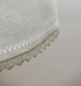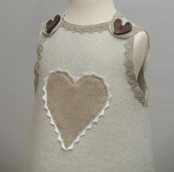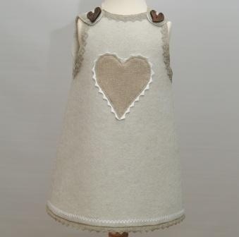 Kjolen er pyntet med en linfarget, vevd bomullsblonde langs nedre kant, samt rundt halsen og armhulene. På brystet er det applikert et hjerte, klippet fra en grovvevd bukse i 100% lin. Hjertet er rammet inn av en hvit, vevd bomullsblonde. Kjolen er også pyntet med en smal, hvit kroklisse nederst langs kjolekanten.