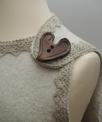 I selene er det store, brune, hjerteformete knapper. De kraftige knappene passer godt til det tykke ullmaterialet i kjolen. Knappene er håndlaget i Nepal, fremstilt for hånd eller med enkle verktøy. Bedriften som lager knappene har en sosial profil, slik at vi vet at arbeiderne blir godt ivaretatt.