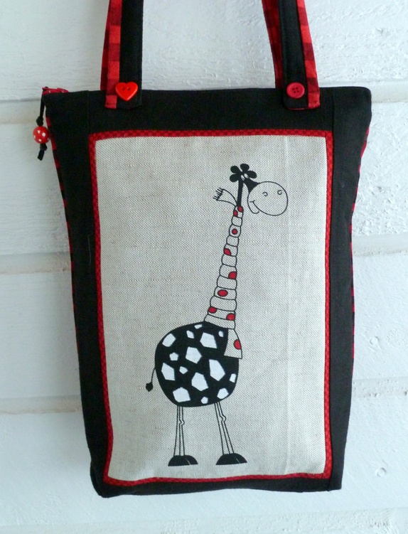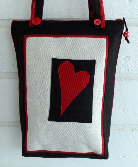 Veske i natur og svart lin, med biser i bomull. Høgd 34 cm, breidd 27 cm. Hankane er 86 cm lange. Baksida har lomme med applikert hjerte. Glidelåslukking oppe. Veska er vattert og er fora med svart bomullsstoff. Dobbel innerlomme, den eine med glidelås.